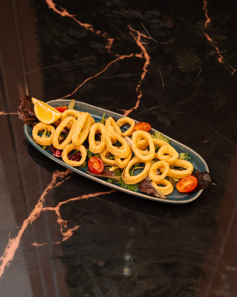Ración de calamares preparados al momento, crujientes y dorados, servidos con salsa de tomate. Un clásico irresistible. Alérgenos: 🦐 Marisco