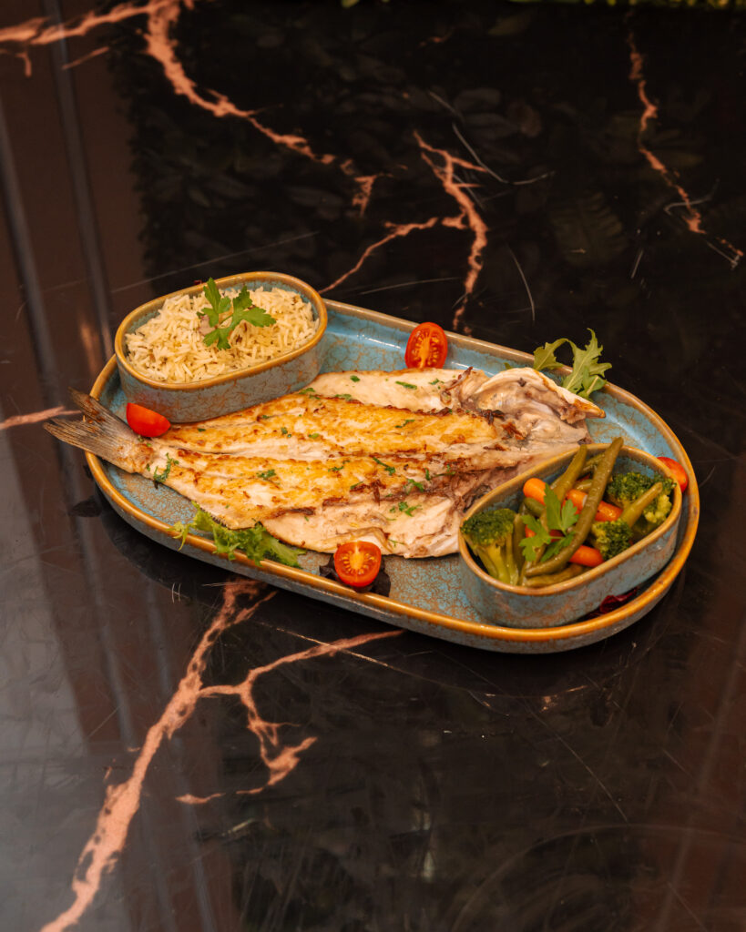 Lubina fresca a la plancha, jugosa y delicada, acompañada de salsa de tomate y guarnición. Ideal para los amantes del pescado suave. Alérgenos: 🐟 Pescado