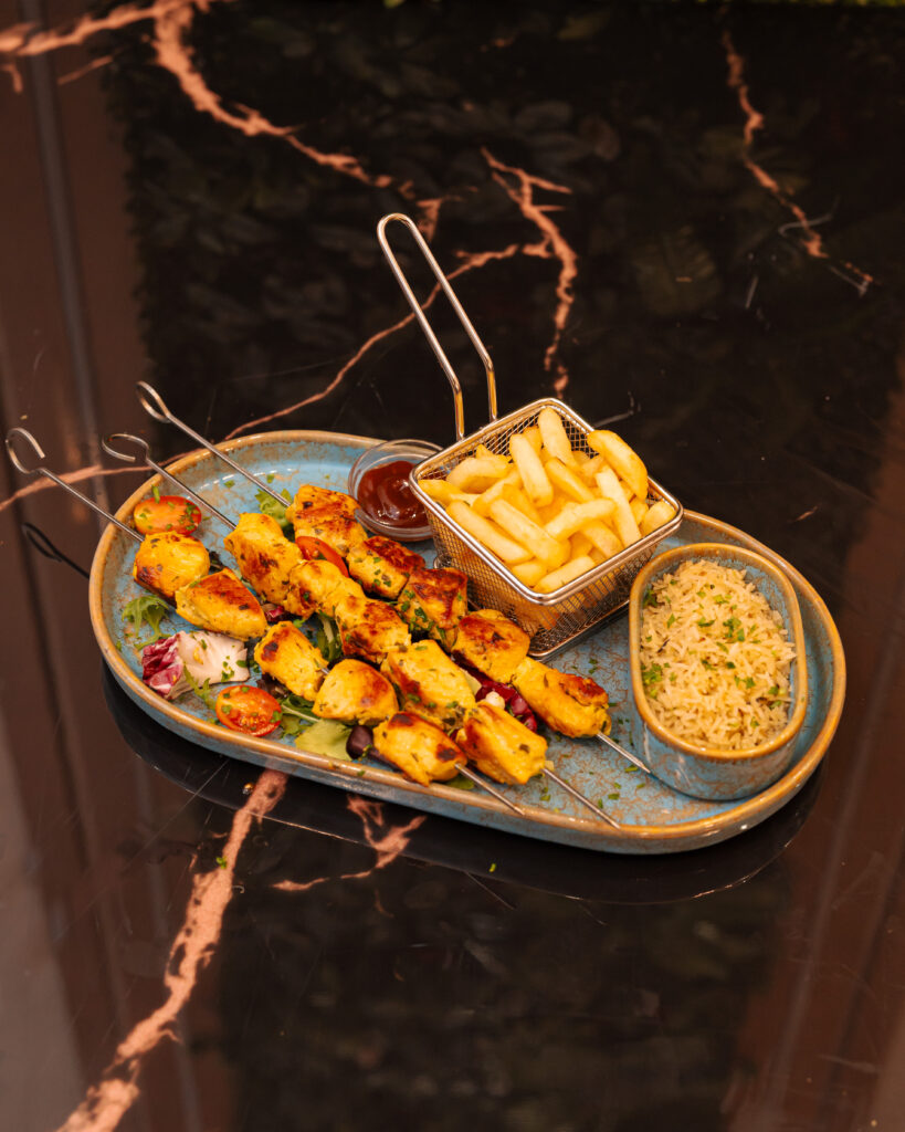 Pinchos de pollo marinados y cocinados a la parrilla, tiernos por dentro y dorados por fuera, servidos con acompañamiento y salsa barbacoa. Alérgenos: 🥛 Lácteos