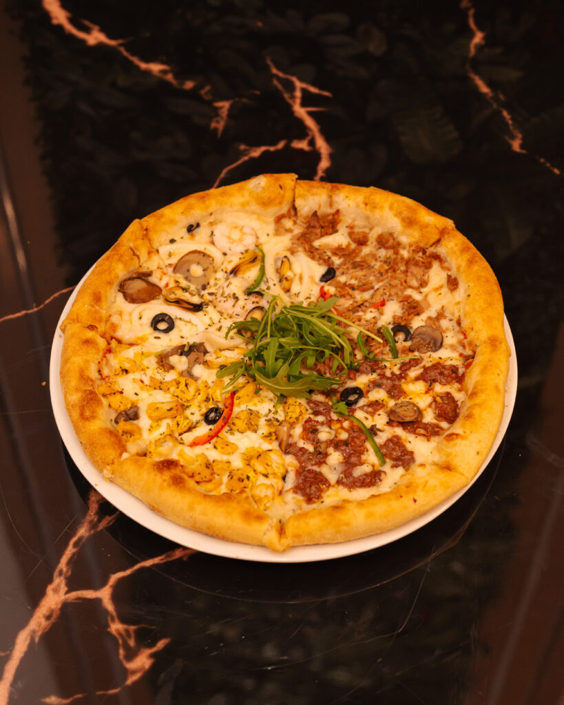 Una pizza variada que combina pollo, carne picada, frutos del mar y atún sobre una base de tomate y queso fundido, ideal para quienes quieren probarlo todo. Alérgenos: 🌾 Gluten · 🥛 Lácteos · 🐟 Pescado · 🦐 Marisco