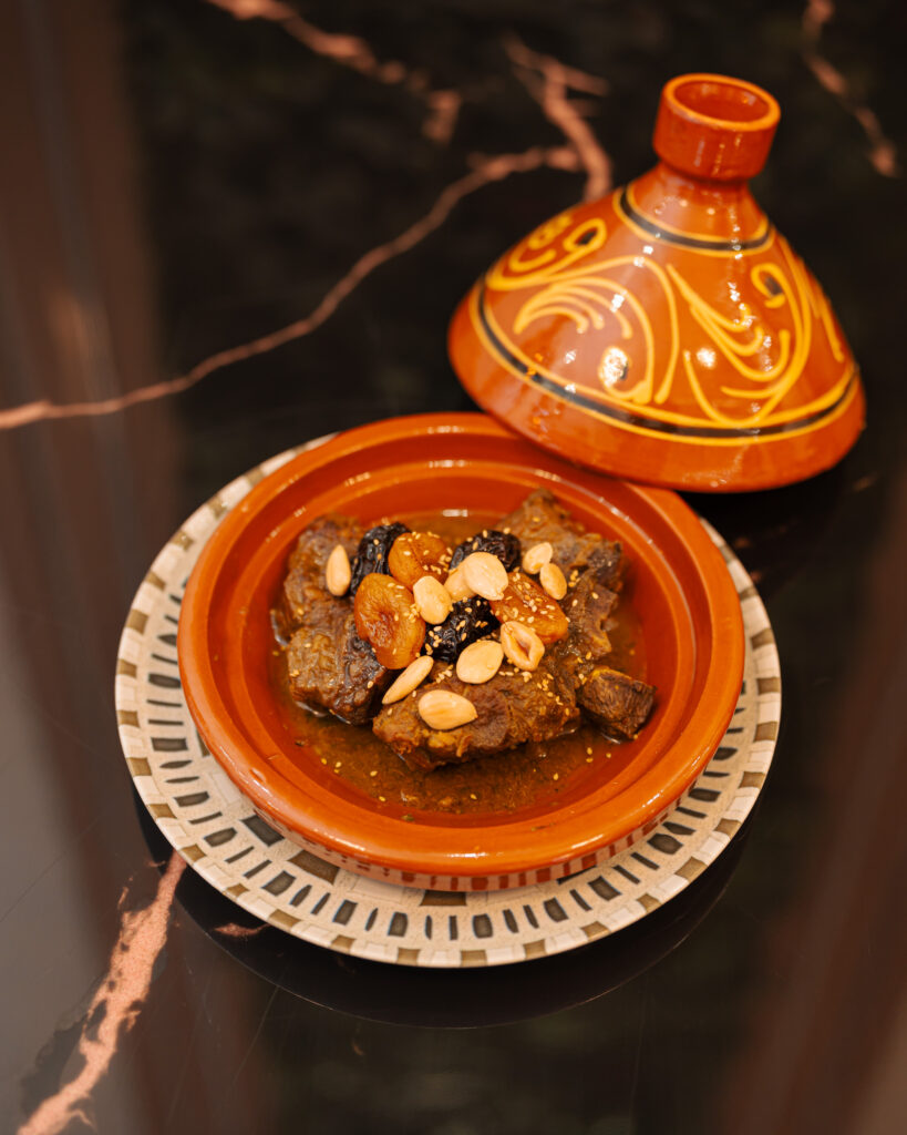 Tajín tradicional elaborado con cordero de sabor intenso, cocinado a fuego lento con ciruelas dulces, almendras y sésamo. Una combinación de matices dulces y salados que representa la esencia de la cocina marroquí.
